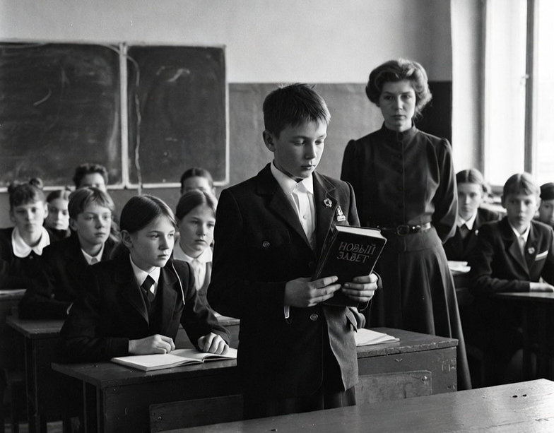 И однажды — это была весна 11 класса последнего, 1989 или 1990 год. Весна 90-го года. Один из ребят у нас в школе принёс Евангелие от Иоанна. И мне дают, награду, что ты этим интересуешься. А я же в то время толковал книгу Откровения на классном часу. Рассказывал, как всё будет. Всех вводил в ужас. Всё должно быть плохо. А время-то было как раз, такая уже свобода более-менее началась. И кто не жил в той эпохе, тот вообще не может представить себе, что это такое. Когда учебников старых уже нет, по истории особенно, история, обществознание, старые учебники уже выбросили, а новых ещё не выпустили. И мы учились по газетам, по журналам, и это просто было уже невыносимо. Вся эта история со всеми этими культами личности, Никитой Сергеевичем Хрущёвым со своей кукурузой и ботинком, это просто уже… Я в 11 классе сдавал, когда на историю пришёл, мне попадается билет. И вопрос: «Культ личности Сталина и его значение для истории России». Я сажусь с таким отсутствующим видом, начинаю рисовать. Нарисовал Сталина, Хрущёва, всех нарисовал, а историчка наша подходит: «Что ты делаешь?» Я говорю: «Рисую». Она говорит: «Что, готовишься?» Я ей билет показываю. Она посмотрела и говорит: «О-о-о». Она смотрит на… «Четвёрки хватит?» Я говорю: «Хватит». Она: «Иди, отпускаю тебя домой». В общем, четвёрку так и получил за экзамен по истории. А сразу уточняю, историю тогда переписывали на ходу, все друг с другом спорят в этих газетах, в журналах, один на другого, другой на третьего, в голов каша. Сначала было интересно, а потом стало невыносимо всё это.